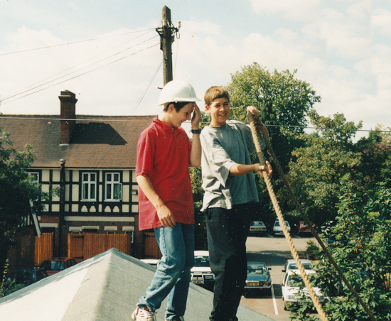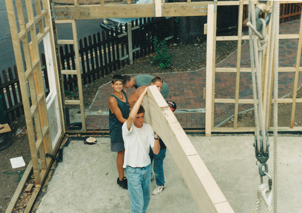 A traditional block and tackle would be used. First we would tie a pulley high up in the large oak tree adjacent