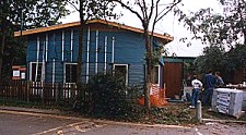 In this picture, work on affixing the blue paper has almost finished. The pallets of breeze blocks are for the rear wall.  As this is not normally seen by the public the church allow us to face it with Breeze blocks instead of Cedar.