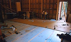 Whilst work continued on the exterior of the hall the floor was laid. Thick battens of wood with insulating foam between them hold the floor above the cold concrete base.