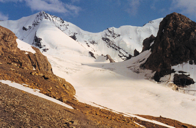 THE FINAL APPROACH TO THE BLUEMLISALPHUTTE (2835m) WITH WILDI FRAU BEHIND. IT DOESN'T LOOK FAR TO THE HUT. IT TOOK AGES BECAUSE WE WERE SHATTERED! |