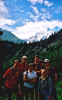 ABOVE: A view of the mountains on the other side of the Kandersteg valley. The tallest is the Doldenhorn (right) and on the left is the Bluemlisalphorn. BELOW: Group 1 stop for a rest. |