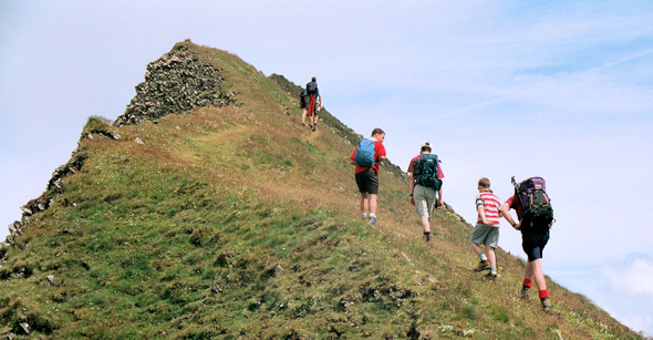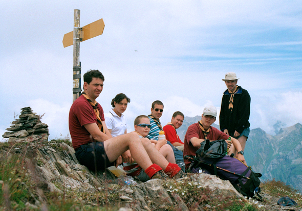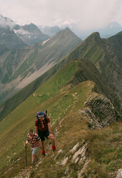LEFT: Andy and Steve on the ridge just before the top. The walk from the cable car station is an uphill slog, but not particularly difficult. The paths are well defined and easy to walk on. The Scouts take turns navigating under the watchful eyes of Dave, who was leading group 1. As the path approaches the ridge the ground gets steeper, and the ridge itself is quite sharp. |