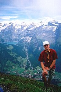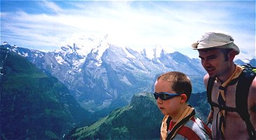 ABOVE: Mark and our nervouse Scout near the top of First with the Doldenhorn dominating the view behind them. RIGHT: Jon at the top of First with Lake Oeschinensee in the background and Kandersteg far below. |