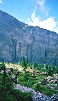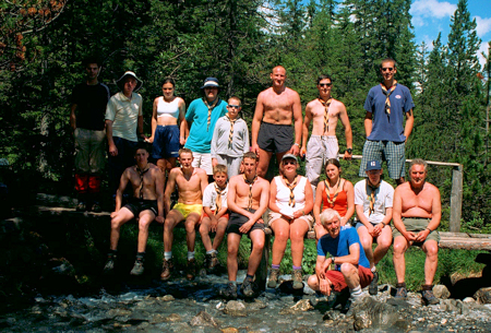 LEFT: A distant view of the Doldenhorn (right) and Bluelisalp group (left) on the way to the Doldenhorn Hutte. At this point the path has just popped out above the tree line and passes through a rocky moonscape. The only building up here is the Doldenhorn Hutte From the bridge, some of the leaders and RVU crew members continued up to the Doldenhorn Hut. The rest of the group went down to Oschinensee for a quick dip.