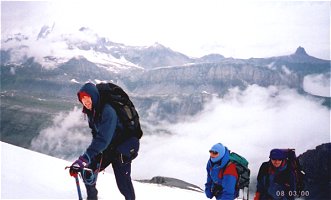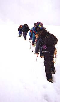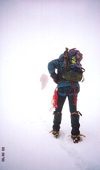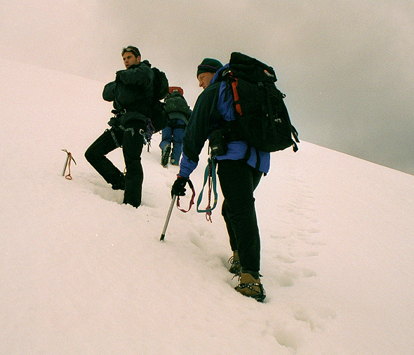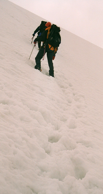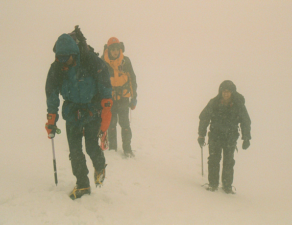 As we set off on the snow, the weather was showing signs of being less friendly. The clouds were moving in to obscure our view and clear moments were taken advantage of by the photographers. Derek Tungatt led the way up the snow slopes which were becoming gradually more steep as we reached the summit. Most of the slopes were snow with just a couple of short sections of ice. |
