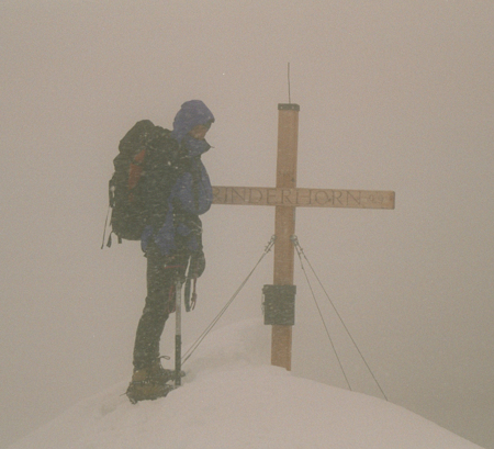 Finally we reached the summit. The weather was now pretty bad. The wind was driving the snow into your face and the clouds were particularly grey. There was also a strange buzzing noise. At the top we decided that the buzzing, which seemed to be coming from the cross marking the top, was some king of transmitter inside the box mounted on the cross. However, we soon realised that this buzzing was being made by every metallic object around us and was a product of the impending electrical storm. There are certain places that it is not considered good form to be during an electrical storm. On top of a 3453m peek is one of those places. The lightening strike and huge clap of thunder finally alerted us to the fact that we were in the middle of a storm cloud.