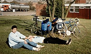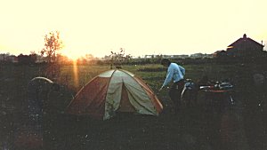 At 4.45 we reached an expensive camp site ( £.3.20 ). The tent was still soaked - like tissue paper. No pub therefore we went to bed at 6.00, talked, ate
